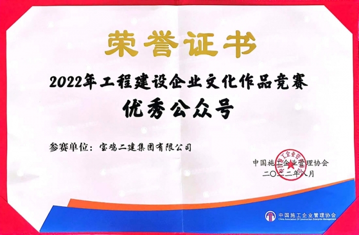 在喜迎二十大之際,中國施工企業(yè)管理協(xié)會(huì)在南寧隆重召開2022年度工程建設(shè)企業(yè)文化成果交流會(huì),會(huì)議公布了2022年度工程建設(shè)企業(yè)文化作品競賽評選結(jié)果,并進(jìn)行表彰。寶雞二建公眾號(hào)被評為“全國工程建設(shè)行業(yè)優(yōu)秀公眾號(hào)”,企業(yè)文化作品《做自豪的魯班傳人 當(dāng)果敢的抗疫小兵》微視頻榮獲三等獎(jiǎng)。